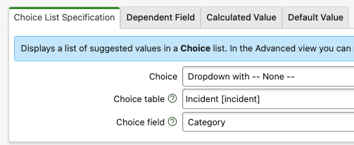 - Navigate to the Dictionary record for the other field(s) that will be driven by the Incident Categories.