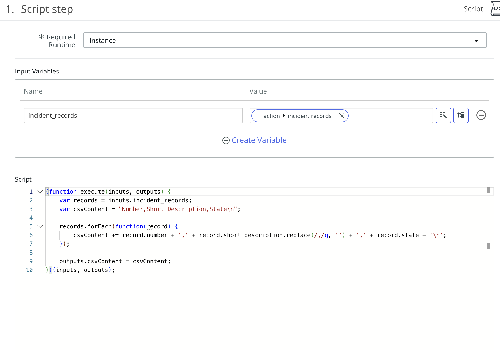 csvContent += record.number + ‘,’ + record.short_description.replace(/,/g, ”) + ‘,’ + record.state + ‘\n’;