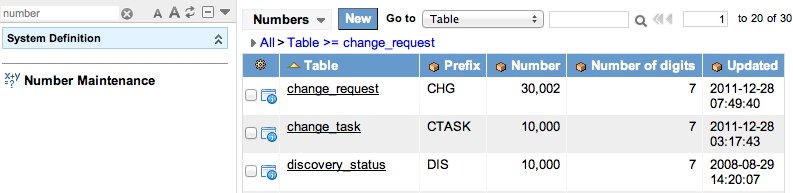 The first step is to navigate to the ‘Number Maintenance’ module and find the record for your table. In this case, I’m looking for the record for the ‘change_request’ table as shown here…