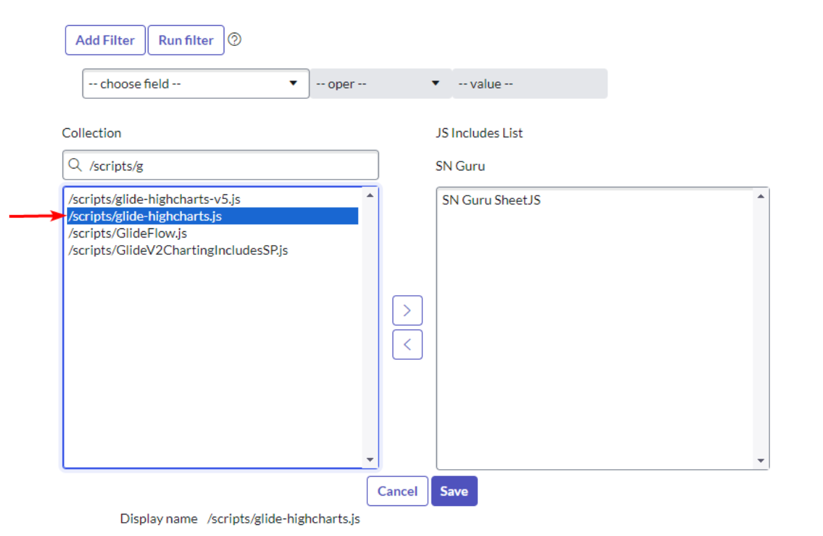 For this article, which has educational purposes, I will download version 11.4.3 of the library and use it in my PDI. For commercial use, it is recommended that you purchase licenses directly through their website. Another option is to use the version available within the platform, which in my research (<instance-name>/scripts/glide-highcharts.js) is 9.3.2.